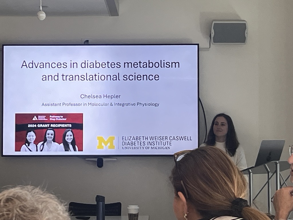 The event showcased the breadth and impact of ADA-funded research at Michigan. Key presentations were given by Chelsea Helpler, PhD, and Steve Parker, PhD, both ADA-supported investigators whose innovative work is advancing our understanding of diabetes and its complications. Dr. Hepler received the 2024 ADA Pathway grant for her research, Integration of Circadian and Inflammatory Pathways in Metabolic Homeostasis, which will delve deeper into emerging evidence indicating that circadian disruption is a major contributor to metabolic disease. Dr. Parker was awarded the ADA’s prestigious Outstanding Scientific Achievement Award in 2024 for his work in genetic predisposition in diabetes and related traits.